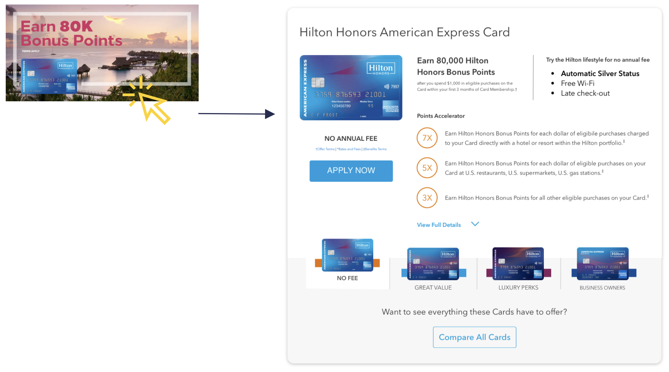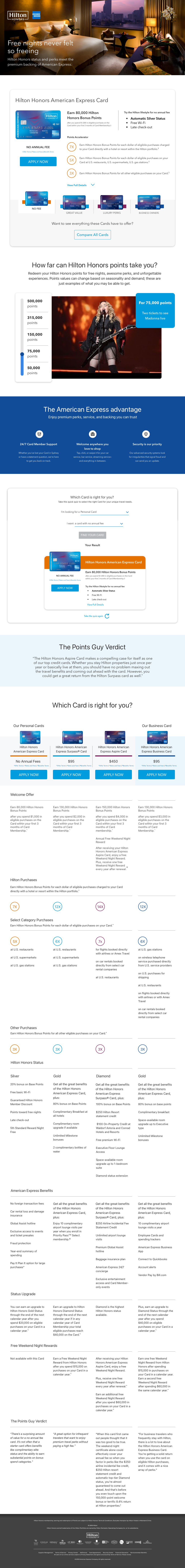 The “At A Glance” module adjusts according to the ad the user clicks on to land on the page. If the ad speaks about “Earn 80,000 points”, this module will show the Hilton Honors x American Express Card.